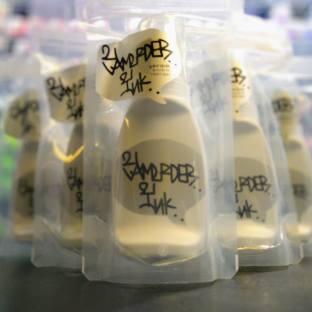 YAMURDER INKSHINY SILVER MOP グラフィティーアーティスト達の日々の研究と実験から生み出された濃く明るい発色の油性インク。市販の製品には存在しない30mm幅の太く美しい線画を書く事が出来ます。更に、使用時に本体を押す事で、簡単にドリップ(垂れ)させる事が可能です。 ¥1,760(税込)